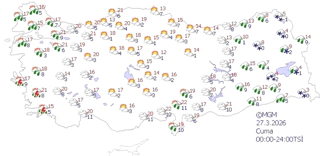 Meteoroloji Genel Müdürlüğü’nün yaptığı son değerlendirmelere göre, ülkede genel itibarıyla parçalı ve çok bulutlu bir hava durumu hâkim olacak. Özellikle Marmara'nın batısı, Kıyı Ege, Doğu Akdeniz’in doğu kısımları ile Doğu ve Güneydoğu Anadolu’nun bazı bölgeleri, Rize, Artvin, Bayburt, Manisa ve Konya'nın güneyi ile Antalya’nın iç ve doğu alanlarında aralıklı yağışlar görülecek. Yağışların çoğunlukla yağmur ve sağanak şeklinde olması beklenirken, Doğu Karadeniz’in iç bölümlerinde ve Doğu Anadolu'nun kuzey ve doğusunda (Iğdır hariç) karla karışık yağmur ve yer yer kar yağışları görülecek. Hakkari, Bitlis ve Van çevresinde kuvvetli karla karışık yağmur ve kar, Şırnak çevresinde, Siirt ve Batman’ın kuzey kısımlarında ise etkili sağanak yağışlar bekleniyor. Yüksek kesimlerde sağlam kar yağışlarının da olması muhtemel. Rüzgarın Kıyı Ege’de güneyden fırtına şeklinde (50-70 km/sa) eseceği tahmin ediliyor. Ayrıca, Doğu Karadeniz'in iç kesimleriyle Doğu Anadolu’da yüksek kar örtüsüne sahip eğimli alanlarda çığ ve kar erimesi riski mevcut.